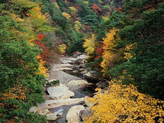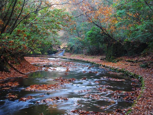平らで滑らかな一枚岩が川底に続く、たいへん珍しい渓谷。それに続く山道からは、鮮やかな赤、黄色に色づいた紅葉を見ることができます。紅葉を見ながらのんびり散策を楽しんでみては。