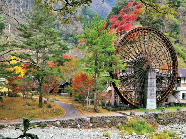 佐伯市本匠村のシンボルともいえる“大水車”がまわる『小半森林公園キャンプ場』周辺は、美しい紅葉スポットとしても注目を集めています。併設する『水車茶屋なのはな』では、地元本匠産の蕎麦粉を使ったメニューが楽しめます。