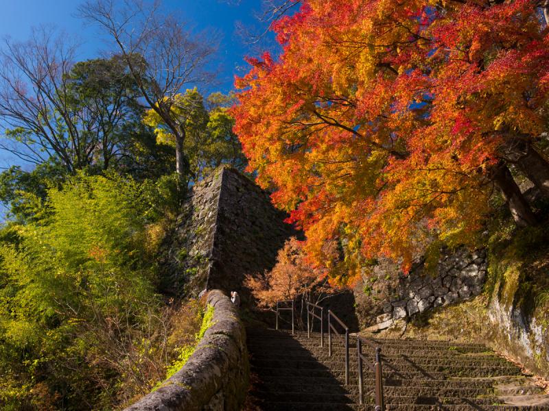 断崖絶壁に築かれた難攻不落の名城で、瀧廉太郎の名曲「荒城の月」のモチーフとも言われている岡城跡。モミジを中心とした美しい紅葉が包み込む城跡では、本丸、二の丸、三の丸、西の丸など主な曲輪が現存し、その姿を見ることができます。