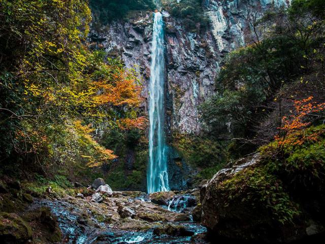 2017年に「祖母・傾・大崩ユネスコエコパーク」に選ばれた祖母傾国定公園内にある渓谷。大分・宮崎両県にまたがる夏木山に発する北川の支流で、8Kmに渡る巨大な花崗岩の一枚岩を覆うように紅葉が広がります。