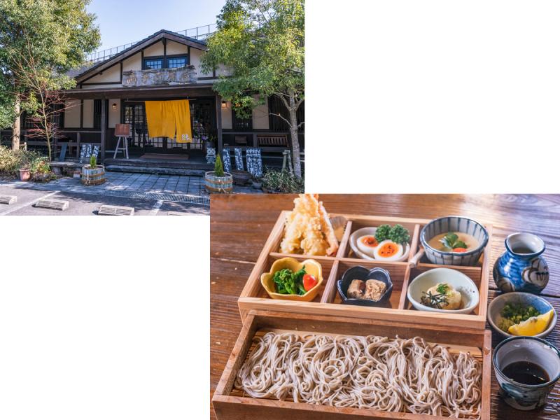 両子寺近くにある蕎麦が味わえる店。人気は、ネーミングからもご利益がありそうな「開運そば」。両子山系の名水で打った蕎麦に、地元野菜を使った天ぷら、小鉢などが付いた大満足の内容。国東の特産品を扱うお土産処も併設しています。