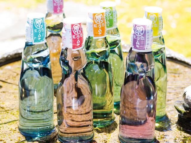 明治32年創業の老舗味噌醤油蔵が作るカラフルな「虹色ラムネ」。野菜や花から抽出した天然色素を使用しているため、光にあたると徐々に色が消えていく様子から、この名前が付けられたのだとか。日田の天然水を使用していて、すっきりとした味わいです。