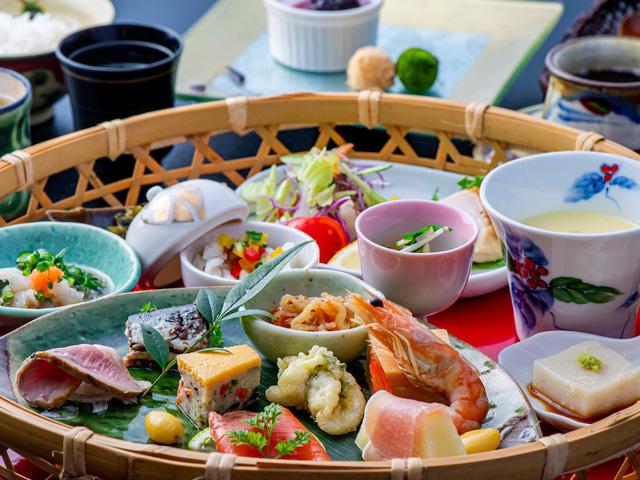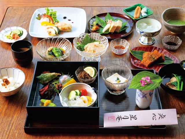 約100年の古民家を改築した情緒あるお食事処。数ある創作料理の中でも「華かご膳」が人気のコースで、中津の鱧をはじめ、季節の旬の素材がふんだんに盛り込まれた贅沢な料理が味わえます。景観や雰囲気など、各部屋毎で異なる風情を感じさせる空間も素敵です。