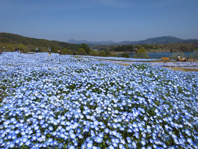 棚田を利用した広大な敷地に、四季折々の花々が咲き誇ります。春はチューリップ(3月20日~4月上旬頃)やネモフィラ(4月中旬~5月GW頃)が見られます。ネモフィラは県下最大の35万本で川をイメージ。船頭人形など写真スポットも!