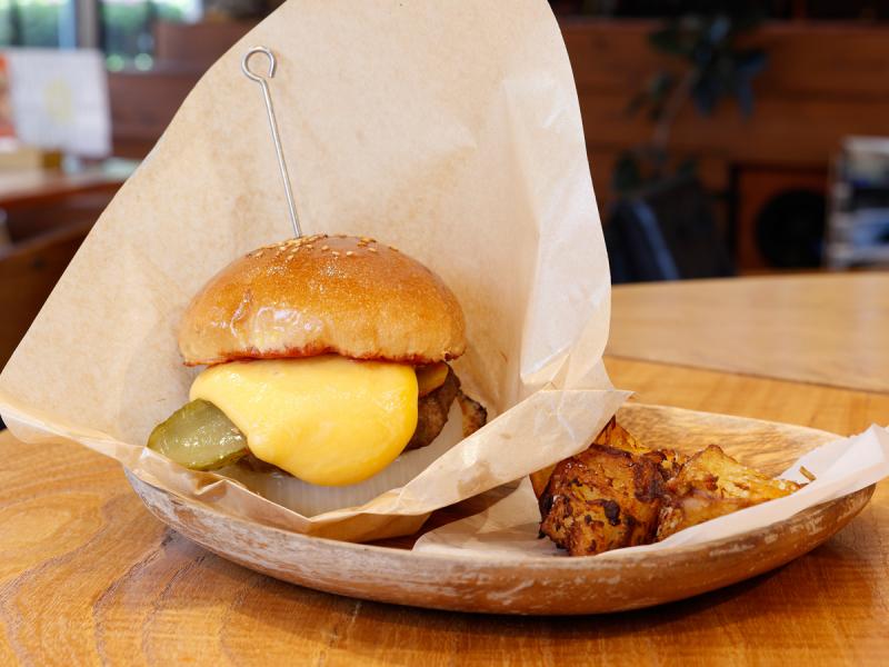 東京の『自由が丘バーガー』監修のグルメバーガーが味わえるカフェ。人気ナンバーワンは、3種のブレンドチーズを使った「リーフデチーズバーガー」。ふわふわの分厚いバンズ、国産牛のパテや甘みのある淡路島産タマネギなどこだわりが光る一品です。