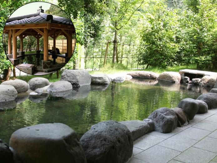 玖珠川沿いにあり、渓流を眺めながら入浴できる露天大浴場と8室の貸切湯があります。貸切湯は岩風呂が4室、石切と檜風呂が各2室あり、すべて半露天のナイスロケーション。源泉掛け流しの湯は、とろみを感じる、なめらかな肌感。川のせせらぎをBGMにゆっくり過ごして。