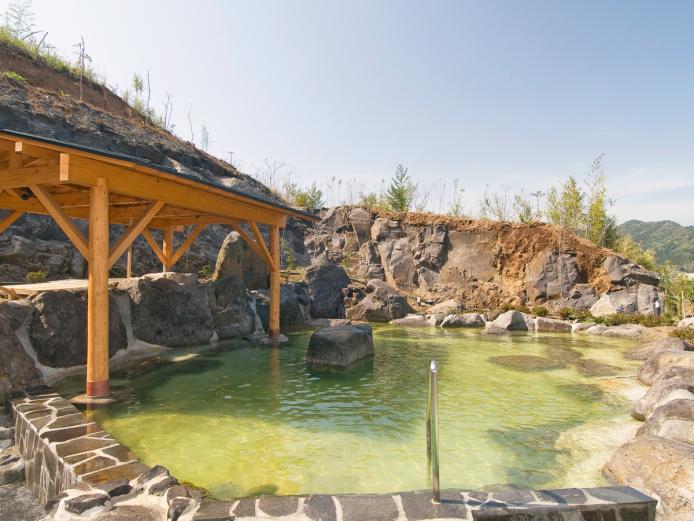 阿蘇くじゅう国立公園内に位置し、くじゅう連山が一望できる贅沢なロケーション。男女日替わりとなる2つの浴場には、計16種もの湯船が備わります。驚くのは湯船によって泉質が異なるということ。乳白色の硫黄泉がメインながら、皮膚病系に効能をもつpH2.1の酸性緑礬泉、クセのないやわらかな単純温泉など4種の泉質が湧きます。なかでも酸性緑礬泉は江戸末期に見つけられたという源泉で、「薬湯」と呼ばれるほど効能豊か。飲泉すれば胃腸にもよいとか。