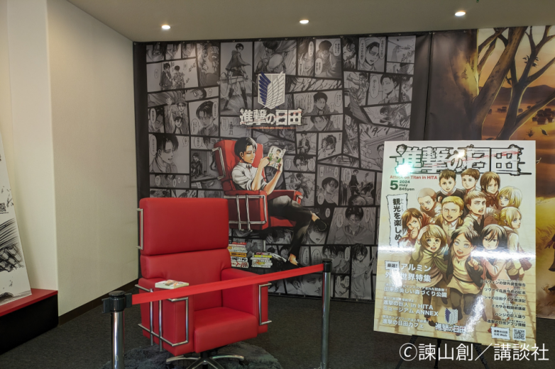 「進撃の巨人 in HITA ミュージアム」では、原作者の諫山創の貴重な原画、イラスト、幼少期の作品など、そのルーツに触れることができます。併設する道の駅 水辺の郷おおやまでは、大山町の梅を使った梅酒や日田市の特産品の販売、そして『進撃の巨人』コラボグッズなどを販売しています。
