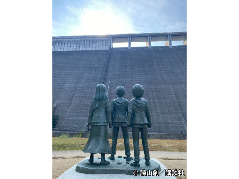 日田市大山ダム下流広場には、「進撃の巨人 エレン・ミカサ・アルミンの少年期の銅像」が設置されています。これは、高さ94mのダムを作中に出てくる“人を守る壁”に見立てて、初めて巨人と遭遇した「はじまりの場所」を表しています。