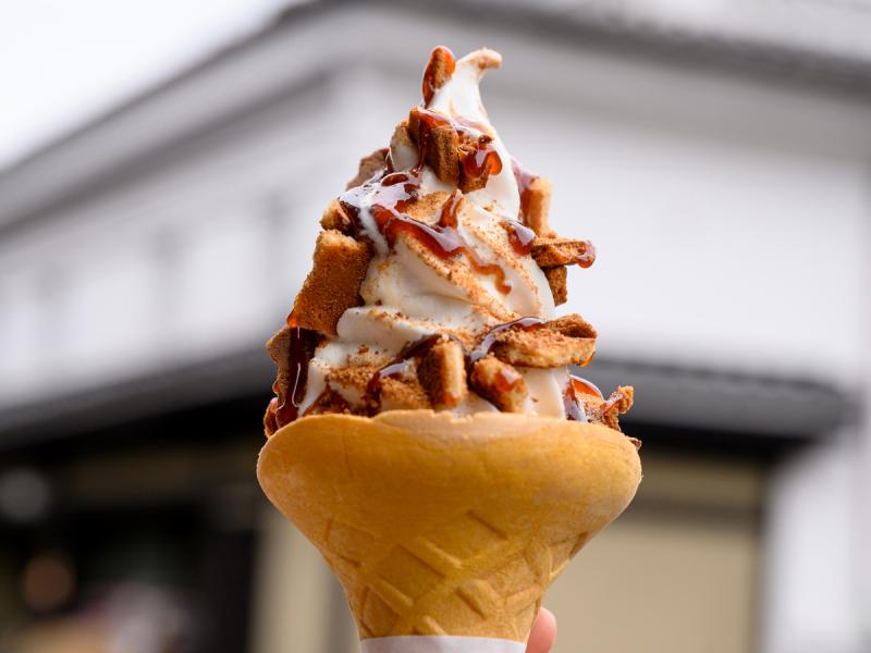 ▲甘じょっぱくて美味しい「味噌ソフトクリーム(コーン)」500円