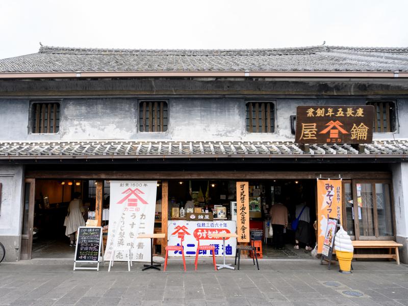 慶長5年(1600年)創業、九州最古級の味噌・醤油蔵として知られる『カニ醤油(鑰屋)』。八町大路商店街の黒壁の建物が目印で、今も昔ながらの製法を守りながら、味噌・醤油・麹を丁寧に仕込んでいます。店頭には「味噌ソフトクリーム」やランチといった町歩き客向けのメニューも用意。麹のいい香りに誘われたなら、ぜひ立ち寄ってみてください。