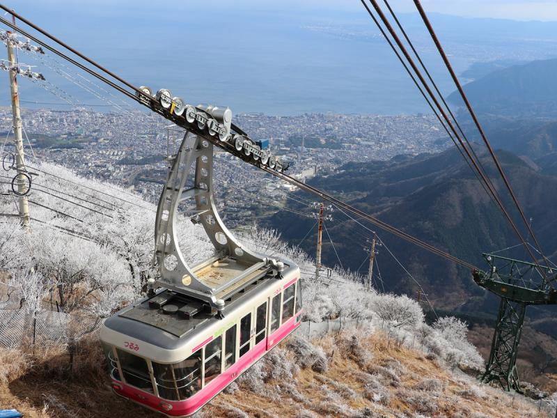 山麓の別府高原駅から大型ゴンドラに乗れば、標高1300mの銀世界。空気が冷たくて風が強い日の早朝に、枝葉に白い華が咲いたような霧氷が山上を覆います。見頃は12月~2月。山頂は氷点下、暖かい服装・手袋・帽子・滑らない靴でお出かけを。
