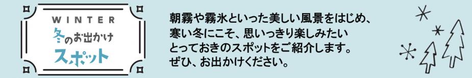 <a href=" https://www.visit-oita.jp/topics/detail/577#shun"target="_blank"><font color="#0033ff">【旬の情報】<br>冬のおすすめお出かけスポット</font><br> 朝霧や霧氷など、冬の空気が澄むほど美しさが際立つ、冬のおすすめのお出かけスポットをご紹介します。</a>