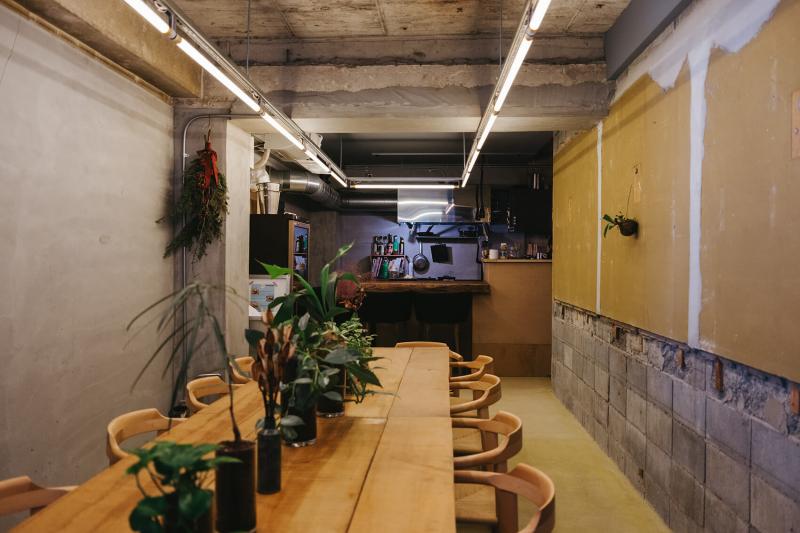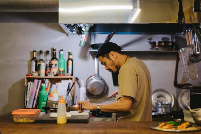 日本酒で心地よくあたたまった足で向かったのが、巡から徒歩5分ほどの場所にある〈Beppu Hostel & Cafe Ourschestra(ウルスケストラ)〉。店主の南享吾さんは別府生まれ、別府育ち。開業以前は長年、東京で料理の世界に携わっていました。そんな南さんが別府に戻ってきて、最初に開業したのがイタリアン。そして同ビルの3Fが空いたので、ゲストハウスをスタート。やがて1Fも空いたので現在のウルスケストラを始め、料理もイタリアンの枠を飛び越えて多国籍の様相を呈すようになりました。