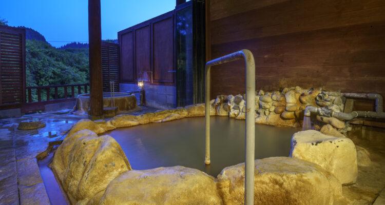 多彩な内湯が楽しめ、露天では滝のせせらぎを感じられる開放的な湯船を楽しめる。5つの貸切湯は畳敷きの脱衣所や箱庭があり贅沢な造り。