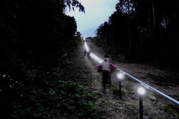 参道の斜面に沿って伸びる白い手すりが夜間になると点灯し、一筋の光に見えることから光る道と呼ばれています。幻想的で非日常感を感じられます。